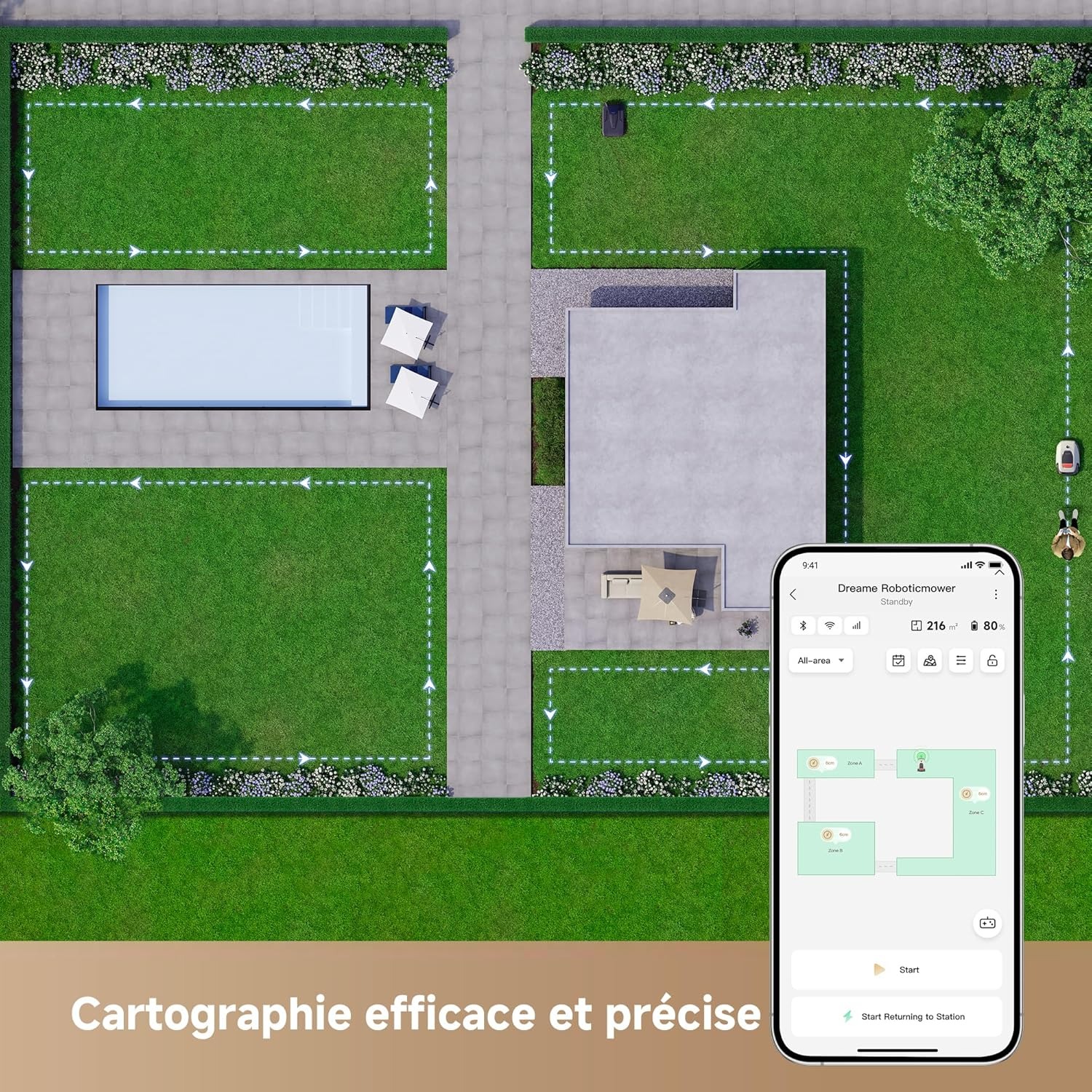Le robot tondeuse A1 Pro utilise la technologie OmniSense pour cartographier votre pelouse sans câbles, permettant des réglages rapides des limites. Il offre une gestion intelligente des zones de tonte via l’application Dreamehome, simplifiant ainsi les routines de tonte.