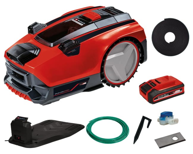 Accessoires fournis | 1 batterie 3,0 Ah, une station de charge, câble de guidage de 12 m, 20 cavaliers, 2 raccords, 3 lames de rechanges |