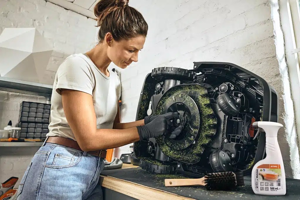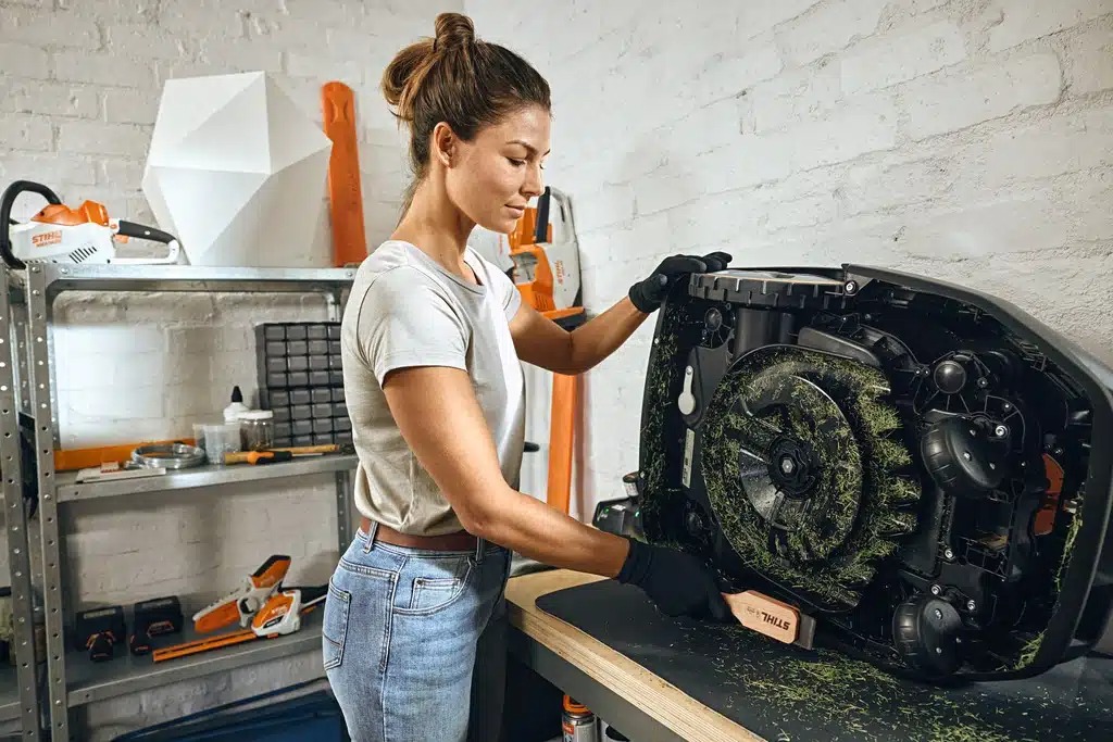 Le système de coupe DIS-CUT de la tondeuse à gazon est breveté. En cas de blocage, le plateau de coupe se repositionnera seul afin de libérer le robot. De cette façon, il n’endommagera votre appareil. Équipé de 3 lames « cutter » et de 4 tranchants de coupe, STIHL vous garantit des coupes de qualité et du matériel durable. Dans le cas où vous devriez remplacer vos lames, ce changement peut s’effectuer rapidement, simplement et sans outil.